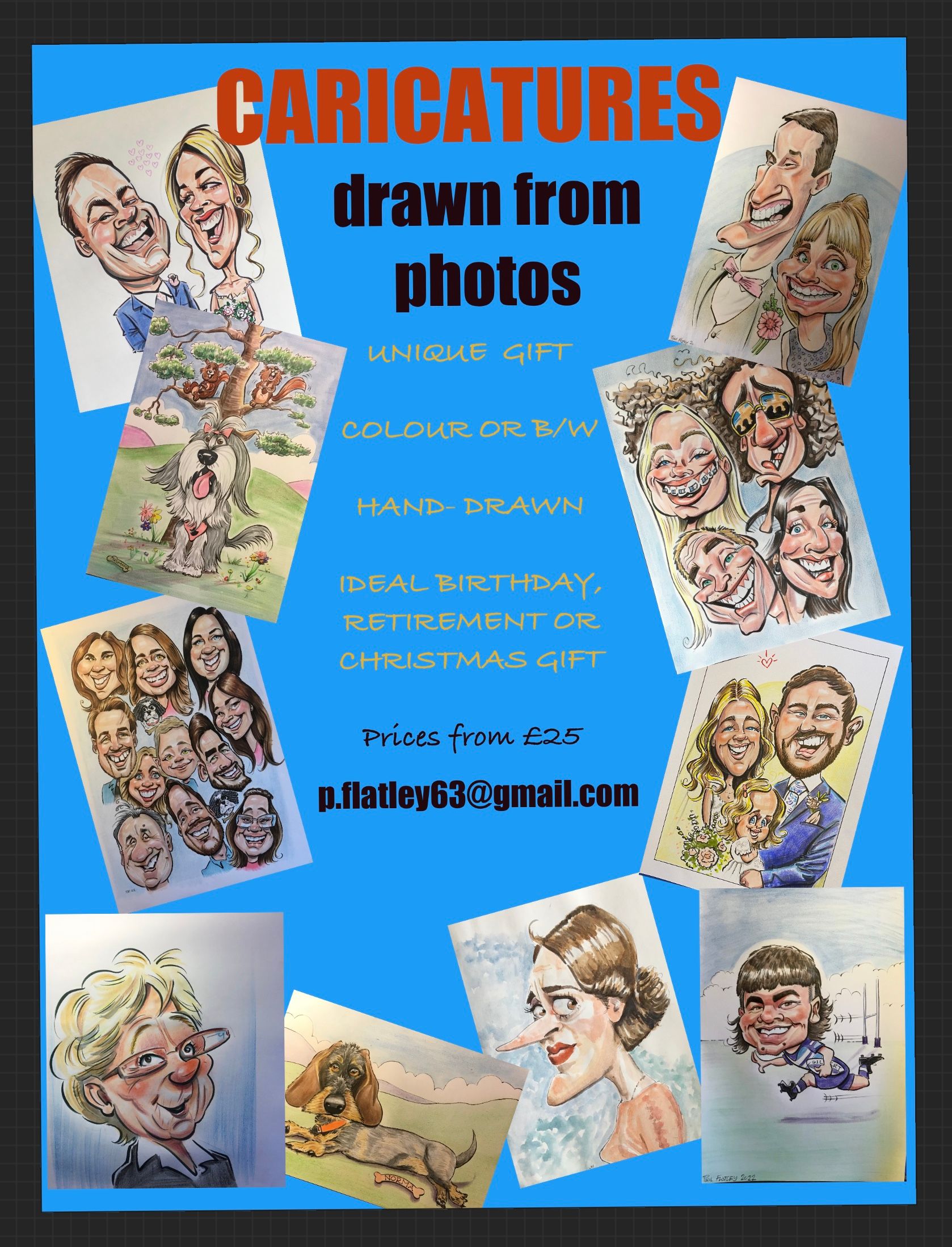 Or, maybe you require a bespoke gift caricature for a friend or family member ? I can draw from your reference photos !